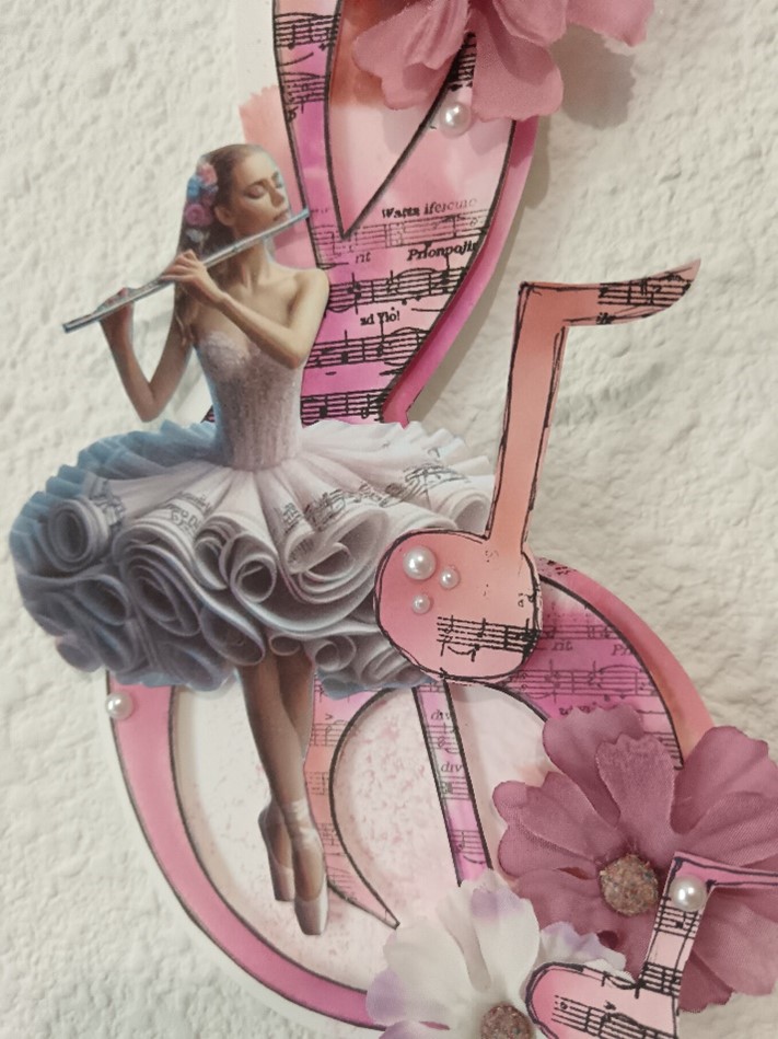 Dans les chutes j’ai découpé des notes de musique. Et j’ai imprimé une danseuse jouant de la flûte traversière que j’ai créée avec l’intelligence artificielle.